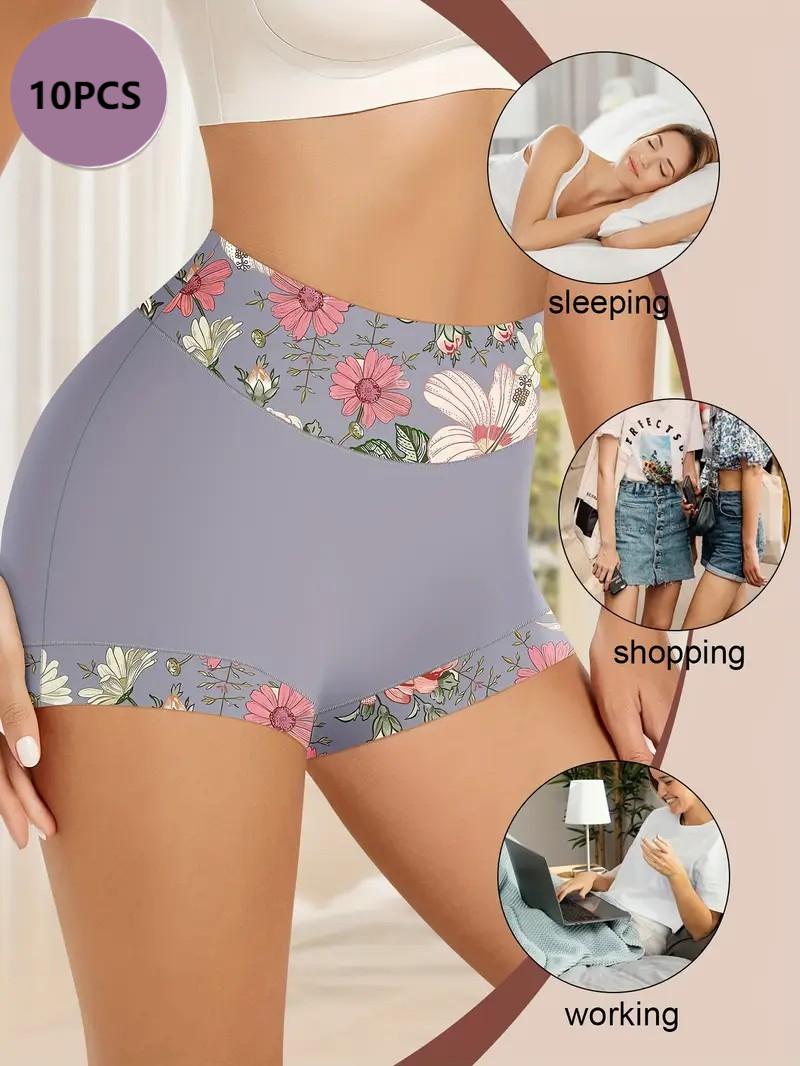 10-pak eleganckich majtek damskich z wysokim stanem - wyszczuplający brzuch, unoszący pośladki, wygodny krój, kwiatowy nadruk